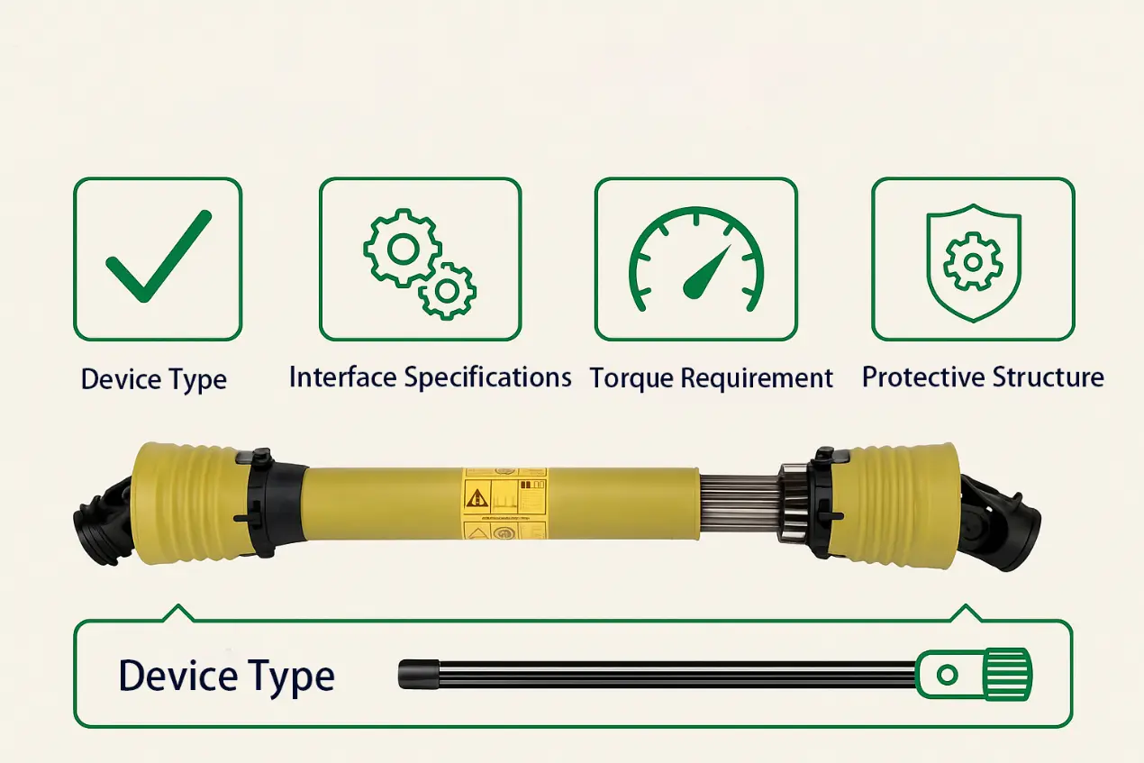 Біріншіден, ауылшаруашылық техникаларының түрін байланыстыру қажет. Әр түрлі жабдыққа PTO білігінің құрылымы, ұзындығы, интерфейс формасы және т.б. түрлі талаптары бар. Мысалы: көлденең жемді араластырғыштар, әдетте, бұршақ болттары немесе ілінісу қорғауы бар PTO біліктерін қажет етеді; Дөңгелек допирлер жалпыға ортақ бұрыштары бар модельдерге жарамды, олар жиі бұрышты өзгерістермен жұмыс істеуге көмектеседі; Тракция тыңайтқышының таратылымдары сияқты жабдық үшін, біліктің еркін кеңеюіне және біліктің шығуына назар аудару керек, бұл біліктің соққыларына, білікті бұру немесе кесіп өткенде, білікке бөлінбейді.